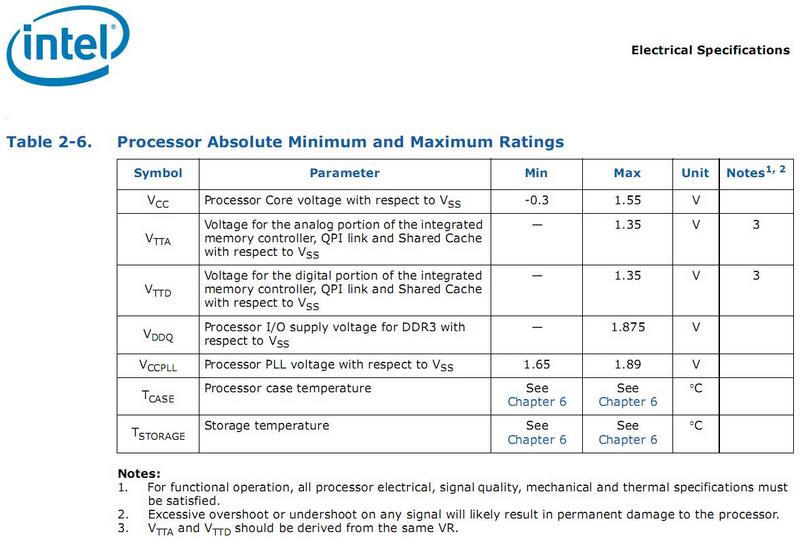 Raccomandiamo di non superare per uso giornaliero i 1.85V per i moduli da 6GB e processori Intel Core i7 ““Nehalem”. La stessa Intel, raccomanda di non dare un voltaggio superiore di 0,5v rispetto al voltaggio massimo impostabile al VTTD del QPI che è di 1.35v. Pertanto 1.35v+0,50v= 1.85v.